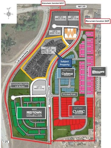 Located at Hwy 105 & Jackson Creek Pkwy, Monument, CO 80132. Fully approved for 240 units with utilities stubbed, roads in place, and water contribution paid. Sales Price $8,000,000.